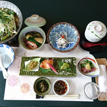 本場下関直送のふぐ料理と産地直送の鮮魚、旬の素材の料理