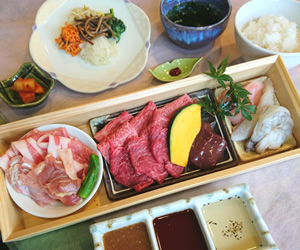 鹿児島黒豚、名古屋コーチン、焼野菜、ナムル・コチュジャン・本場韓国キムチ、ライス、岩もずくスープ、季節のシャーベット。